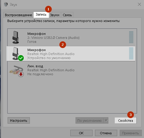 Переходим на вкладку «Запись». На вкладке «Запись» находим свой микрофон, который у нас установлен (он будет отмечен зеленой галочкой), нажимаем на него и переходим в «Свойства»