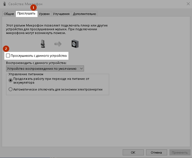 Переходим на вкладку «Прослушать» и на этой вкладке проверяем отмечена ли у вас галочка «Прослушивать с данного устройства». Если эта галочка стоит, то вы будете слышать себя в наушниках, когда говорите в микрофон и посторонний шум. Снимите эту галочку и нажмите «Применить» и «ОК».