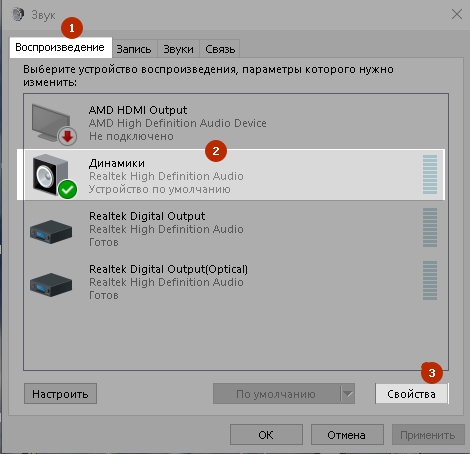 Переходим на вкладку «Воспроизведение», так же находим динамики, отмечаем их и так же заходим в «Свойства».
