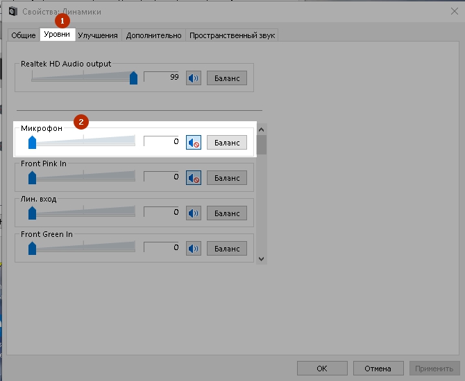 На вкладке «Уровни» проверяем чтобы ползунок в разделе «Микрофон» стоял на нуле, и кнопка справа с изображением динамика была отключена. Нажимаем кнопку «Применить».